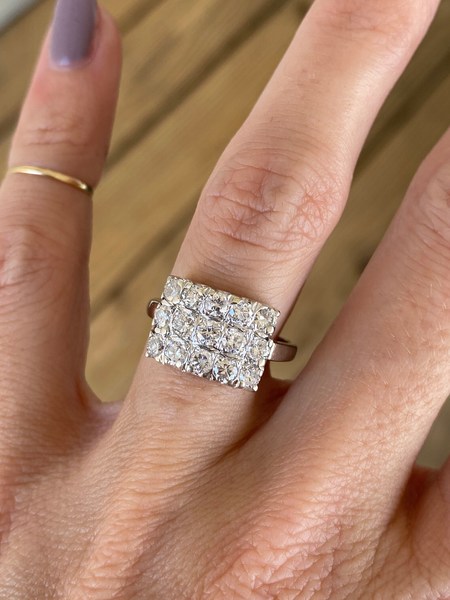 A gorgeous and sparkly vintage cluster ring. There are 15 diamonds of approximately .90ctw. G-H/SI2. They are very white and sparkly. The ring weighs 2.8g and measures 10mm at its widest point. It is stamped 14k.