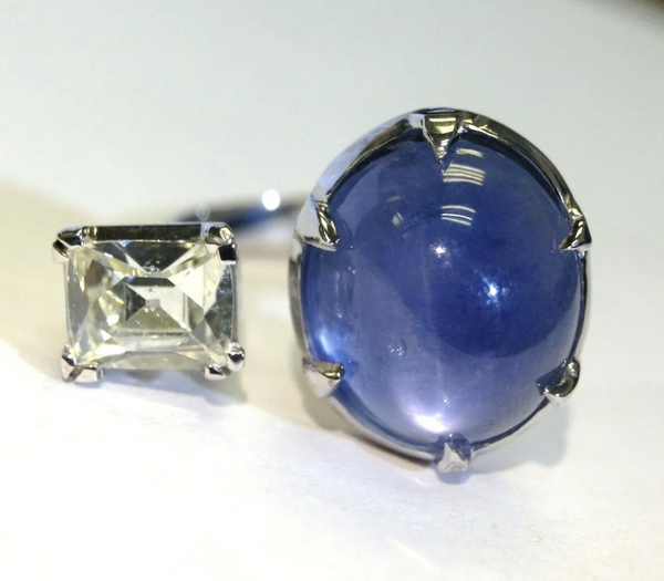 Unique star sapphire and French cut diamond ring. Featuring 14.2 carat Ceylon blue sapphire, with even clarity and moderate star when in light, natural and untreated. Sapphire is 14mm x 12mm x 5mm. The French cut diamond is 0.88 carats, J in color and SI2 clarity. Set in 14K white gold. The ring is a size 6, and sizeable- either down by 1 or up by 4. Weight 7 grams. Shipping is $20 US.