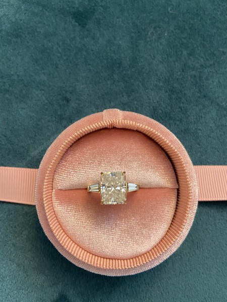 Home » Rings » Three stone moissanite ring - size 4.5 - 14k yellow gold
