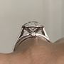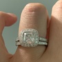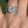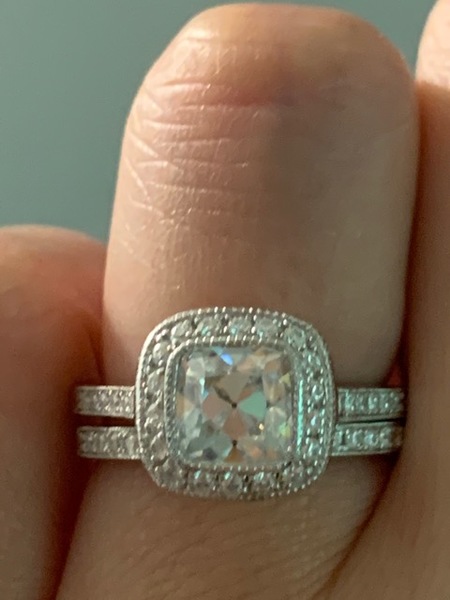 Tiffany Legacy style wedding set with surprise diamonds. 1.4 carat antique cushion moissanite. 6 month old set, paid $1800. Receipt and paperwork available. Selling because I have my eye on another set. Super sparkly and throws beautiful pastels in low light. Size 6