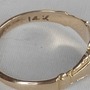 The ring is hallmarked 14K, no maker's mark. The hallmark is crisp and clear, evidencing little wear to this ring. The front of the ring measures 1/4" top to bottom, and the low profile head sits up 1/8" off the finger. The ring weighs 2.6 grams and is a size 7. It is in excellent pre-owned condition.