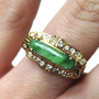 Lovely vintage green jade and diamond ring. Marked 18K 750. The jade is 12mm x 3mm. The diamonds are a total of 0.25 carats, E-F VS. Ring size is 5.5 and sizable. Shipping included in the price if located in the US. Ships in a Jewelry box.