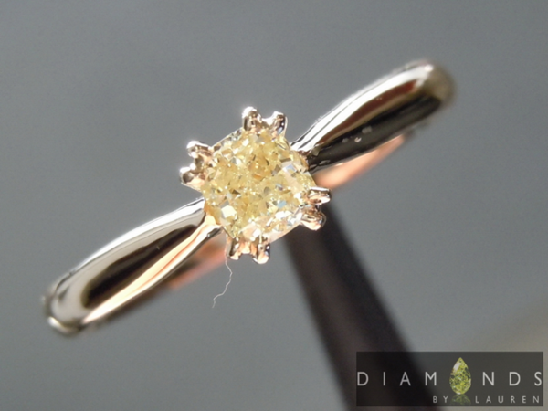 Another serious bargain here and such a beautifully cut stone. This is a really nicely cut natural yellow cushion diamond in a lovely smooth 18kt yellow gold, double prong solitaire ring. The diamond is a 0.31ct SI1 natural fancy light yellow and the setting REALLY makes the most of it, with a distinctly retro, vintage vibe. The profile is super pretty. It's a perfect dainty ring, but the color and cut of the stone gives it so much personality and presence. This is on sale at $650 plus $50 shipping. Size 6. This is a final sale.
