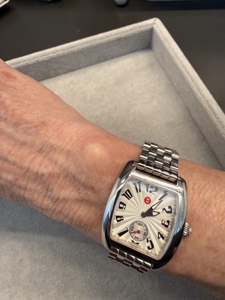 Pre-owned in excellent condition since I have rarely worn it. Light surface scratches on back of band, no visual marks or scratches on the face or crystal.