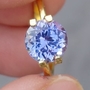 Old JTV purchase. This is a sweet little stone... very brilliant with a lovely medium periwinkle shade. The dominant hue is blue with a violet modifier. It's a super stone for this price range. Completely eye clean. Weight is 1.35ct and dimensions are 8mm. Mined in Tanzania.
