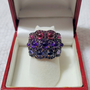 I really hate to sell this ring. I know it's not particularly valuable, but it's so unique. I just need to let some of these pieces go to new homes. I call it my "mixed berries" ring. It consists of oval cabochons and faceted round melee in 3 yummy gems... pink garnet, purple amethyst, and blue iolite. As you can see, the colors have an ombre effect. The ring is cast in solid 14k rose gold, and the pave mountings are plated in black rhodium for a super rich effect. The ring measures approximately 28mm long (north-south). I am unsure of total carat weight, but there's a really nice presence. Ring is a size 6 US (resizable).