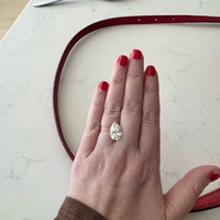 This is a diamond ring with an orangy-brown marquise diamond approximately 1 cart size. There are also channel set baguette diamonds going down one side. I lost the paperwork for the center diamond but I estimate it to be SI in clarity, and it measures 7.9 x 5.5 mm. I do guarantee it to be a diamond of natural origin. The setting is 14 kt gold. A pretty and fun ring.