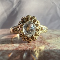 custom klass ring 14 k white gold. singlecut diamonds on struts of gallery. singlestone replica for rose cut diamond. ring is not foil backed and gallery is open, bottom of gallery closed for great reflection. clean just like any diamond or moissy ring. no green fabulous brightness hand picked from new rough. this is a forever ring just like a rose diamond without the bad color we see in some and crystal clear . moiss in the ruff so to speak. new project needs funding or i would keep her. i have never seen a rose cut this white. no green......a photo to show true brightness of stone before i set it. comes with appraisal and receipt