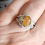 Unique Orangy-Cognac colored moissanite in 14k wg diamond setting. Size is a snug 7.5. Moissy measures 9 x 7. Video available upon request.