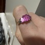 3 stone pink sapphire - sold as lab created. Two wee teeny natural diamonds on both sides. Hot pink under ultraviolet (pictured). Ring weighs 2.09g
