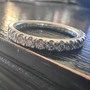 This ring is from Shane Co and is 2.5mm and has about 70 points of nice sparkling stones! It also makes a great stacker or to be worn alone. It's 2.5 grams set in 14k white gold. It is a size 6.75 - maybe a 7 depending on how snug you like those rings.