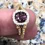 1.18ct vivid purple spinel with .25ct sparkly white full cut diamonds. 14k yellow gold vintage style, engraved setting in a size 6 1/2 can be easily resized.