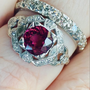 The center stone is a 7.5mm hand cut OEC Moissanite, the pinker ruby is a genuine antique 7mm stone, and the pigeon blood red is 7.2mm hand cut OEC