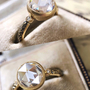The stone is just under 3 carats, with huge spread. The BEST rose cut moissanite I have ever seen. High crown (not flat or glass like at all), bezel set in an 18k gold setting with brush finish.