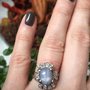 SOLD - This ring has 22 rose-cut diamond accents. The diamonds frame the large 3 carat oval grey star sapphire center.