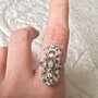 Gorgeous genuine opal surrounded by old cut diamonds. In 18k white gold. US size 8 but easily sizable as band is plain. Low profile so easy to wear.